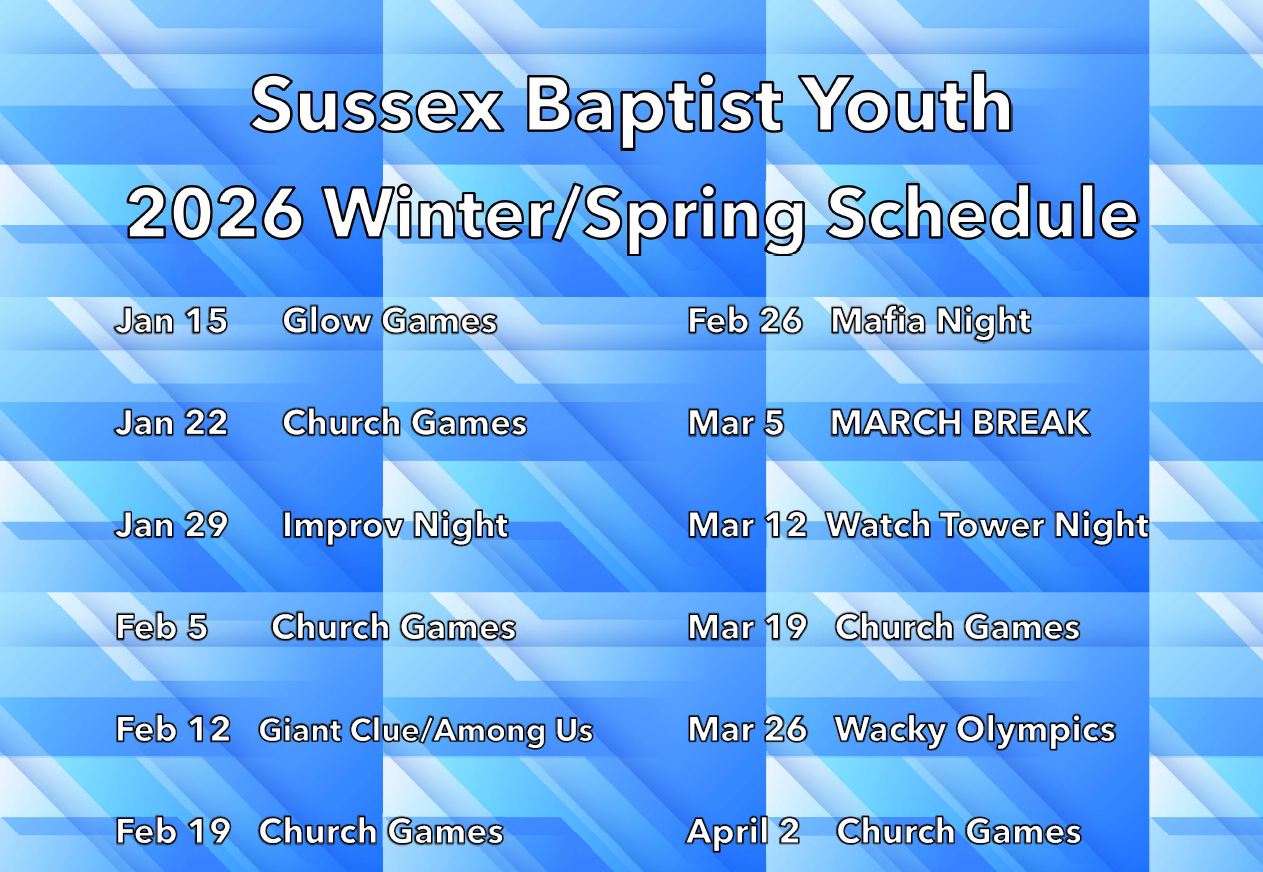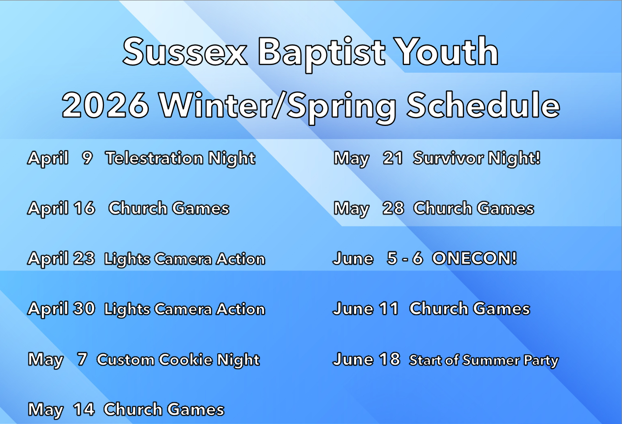 Welcome to Sussex Baptist Youth! We meet Thursday Nights at the church. Each night is a mix of games, fellowship, and devotion time.